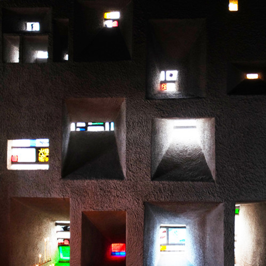 設計中最有趣的部分就是那些分佈在牆上的零星窗口。 柯布西耶採取了在立面上開孔的方法,通過夾層牆間的錐形窗以增強禮拜堂內的光線。 每一堵牆都被大小各異的方窗照亮,連同樸素的白粉牆一起共同賦予了牆體以明亮的特質,這些特質則被更強烈的直接光照打斷。 禮拜堂宣講壇後的牆體之上,光照效果產生了斑點般的圖案,好似星光閃閃的夜空,稀疏的開窗被十字架上方一處巨大開口傾瀉出的光照所讚美,不但創造出了一種強大的宗教圖像而且還具有變革性的體驗。